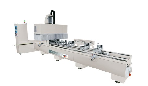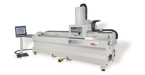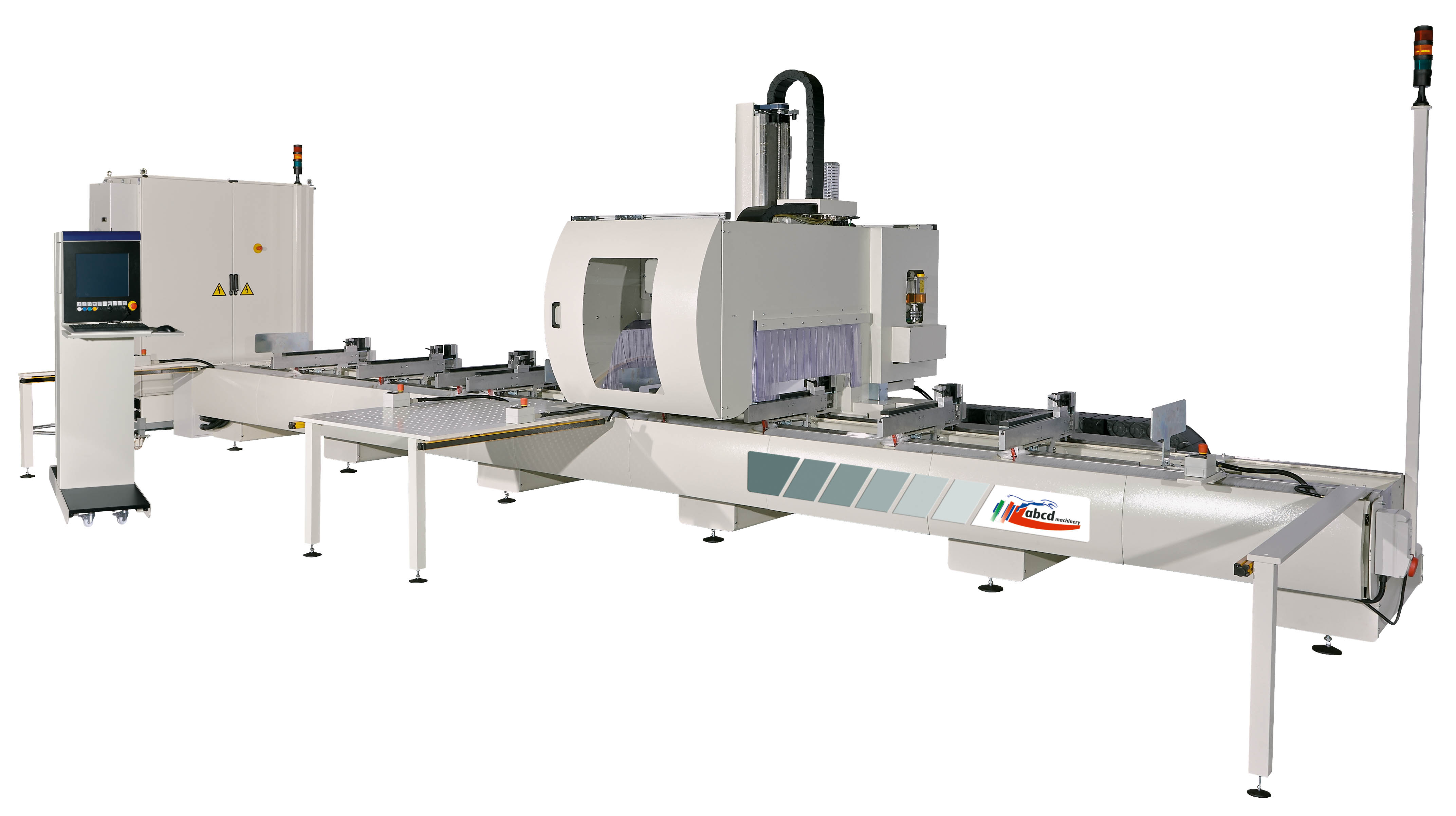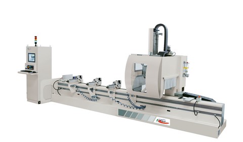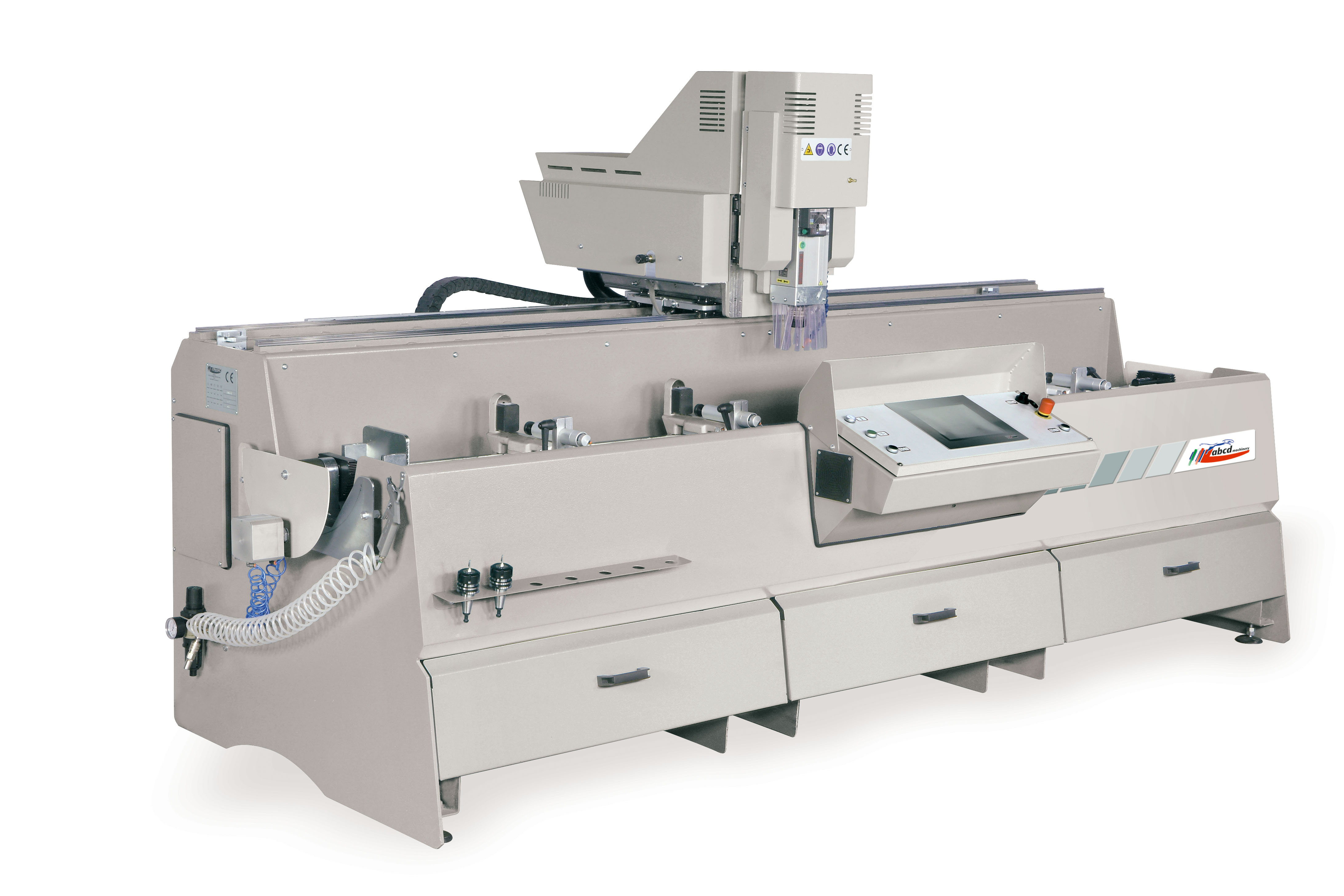 Floor-type vertical spindle machining centre with bridge type gantry assembly with 3 axis controlled by CNC, able to work on extruded aluminium, light alloys, PVC and iron. The machine is fitted with an electric-spindle (7,5kw., 20.000 rpm) with shank according with ISO 30 rule, preset for an automatic tool change. The tool magazine, fixed on the mobile upright, can store till 5 tools to drill, to mill and to thread plus 1 to mill with a side milling cutter. Equipped with 4x standard vices. Kit purifications by micro drop with pure oil.